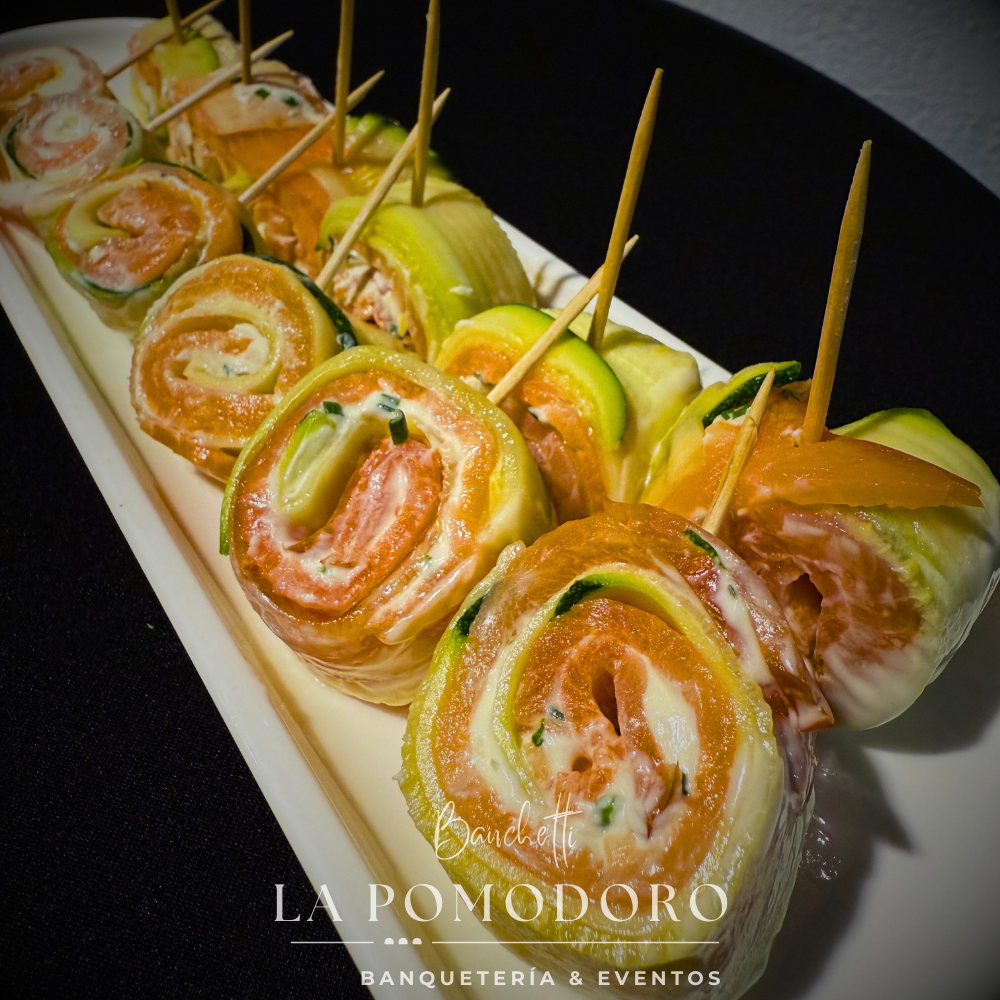 25 brochetas frías rollito de salmón y zapallo italiano + salsa alimonada