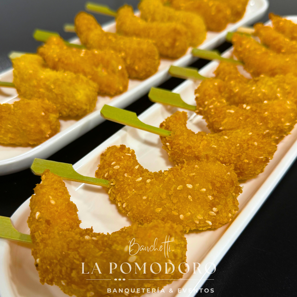 Exquisitas brochetas de camarón crujientes, para deleitar tu paladar.