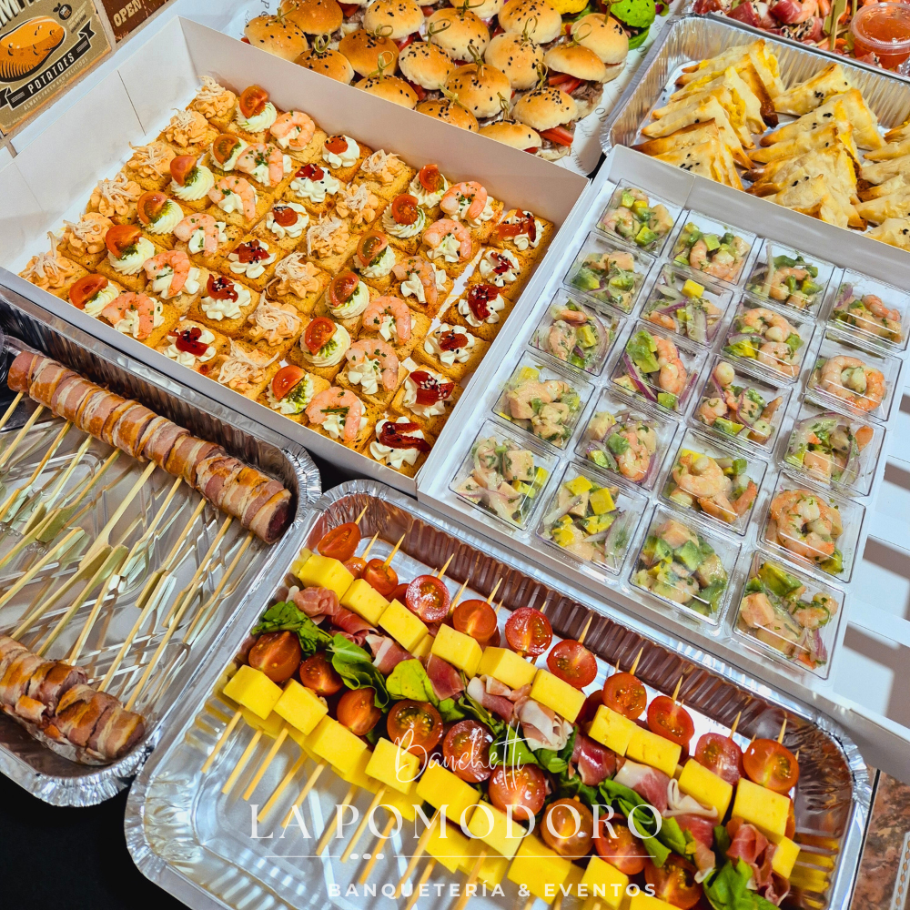- 48 crostinis 4 variedades (mascarpone camarón, capresse, pasta ave pimentón, mascarpone salmón