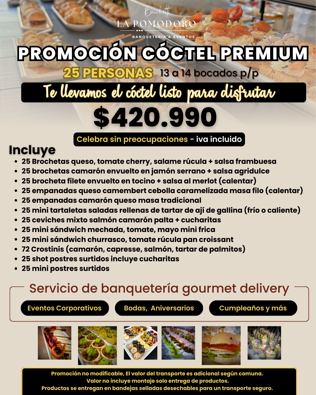 - 25 Brochetas queso, tomate cherry, salame rúcula + salsa frambuesa